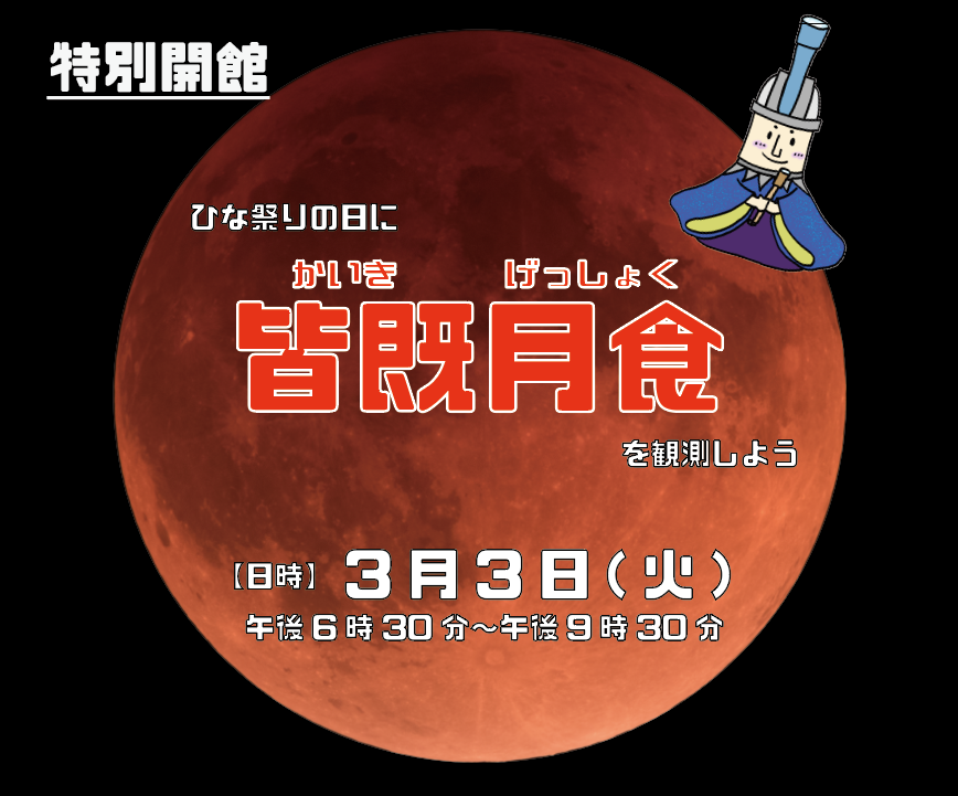 【特別開館】ひな祭りの日に皆既月食が起こります!月が欠けていき、赤い色に変わる様子を観察しよう!